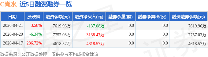 C尚水融资融券信息显示,融资方面,当日融资买入5299.24万元,融资偿还5436.32万元,融资净偿还137.08万元。融券方面,融券卖出0.0股,融券偿还0.0股,融券余量0.0股,融券余额0.0万元。融资融券余额7619.96万元。