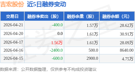 证券之星消息,4月21日,吉宏股份(002803)融资买入5981.79万元,融资偿还2977.85万元,融资净买入3003.94万元,融资余额4.64亿元。