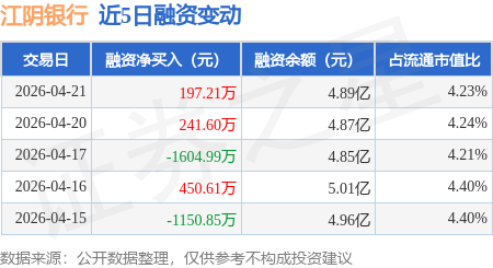 证券之星消息,4月21日,江阴银行(002807)融资买入1746.04万元,融资偿还1548.82万元,融资净买入197.21万元,融资余额4.89亿元。