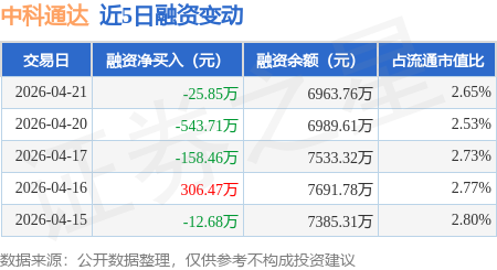 证券之星消息,4月21日,中科通达(688038)融资买入812.96万元,融资偿还838.81万元,融资净卖出25.85万元,融资余额6963.76万元。