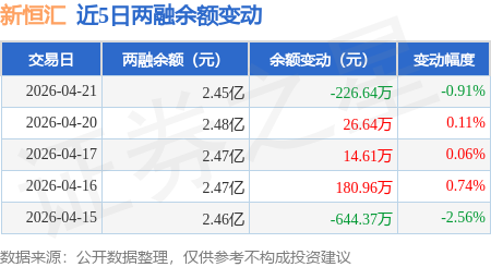 证券之星消息,4月21日,新恒汇(301678)融资买入989.67万元,融资偿还1215.19万元,融资净卖出225.53万元,融资余额2.45亿元。
