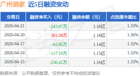 证券之星消息,4月21日,广州酒家(603043)融资买入414.79万元,融资偿还658.67万元,融资净卖出243.87万元,融资余额1.16亿元。