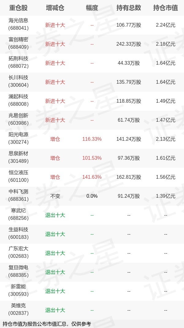 证券之星消息,4月22日南方基金旗下刘文良 王润栋管理的南方广利回报债券型基金公布一季报,近1年净值增长率35.31%。与上一季度相比,该基金前十大重仓股新增海光信息,富创精密,拓荆科技,长川科技,澜起科技,兆易创新;其中海光信息持仓占比1.52%,为该基金第一大重仓股;寒武纪,生益科技,广东宏大,复旦微电,新雷能,英维克等退出前十大重仓股;详细数据如下: