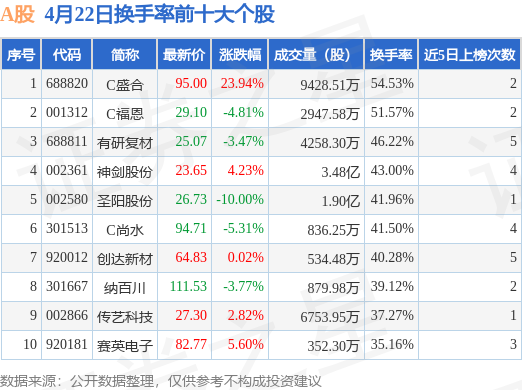 当日A股换手率前10大个股中5只个股收涨,平均涨幅7.32%,其中C盛合(688820)以换手率54.53%排第一,8只个股近5个交易日中多次上榜。