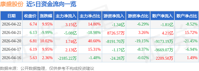 4月22日的资金流向数据方面,主力资金净流入3.15亿元,占总成交额14.8%,游资资金净流出1.34亿元,占总成交额6.29%,散户资金净流出1.81亿元,占总成交额8.52%。