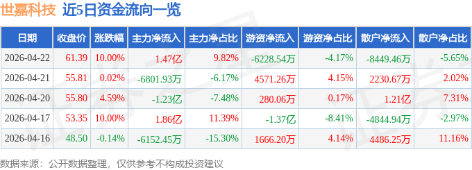 证券之星消息,世嘉科技4月22日涨停收盘,收盘价61.39元。该股于11点7分涨停,1次打开涨停,截止收盘封单资金为4436.04万元,占其流通市值0.32%。