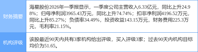 2026年4月20日,中银证券研究员苏凌瑶,茅珈恺发布了对海星股份的研报《掘金AI新材料机遇,发布成长新蓝图》,该研报对海星股份给出“买入”评级。证券之星数据中心根据近三年发布的研报数据计算,该研报作者对此股的盈利预测准确度为73.31%。