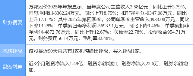 2026年2月10日,中邮证券研究员吴文吉,陈天瑜发布了对方邦股份的研报《方研新材,邦拓芯界》,该研报对方邦股份给出“买入”评级。研报中预计公司2025/2026/2027年分别实现收入3.5/5.2/8.2亿元,实现归母净利润分别为-0.7/0.2/1.2亿元,首次覆盖给予“买入”评级。证券之星数据中心根据近三年发布的研报数据计算,该研报作者对此股的盈利预测准确度为70.79%。