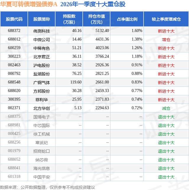 华夏可转债增强债券A的前十大重仓股如下: