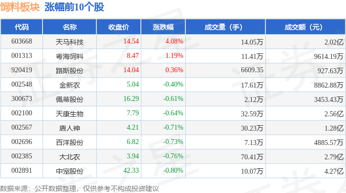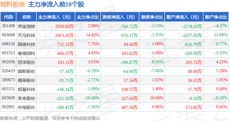 从资金流向上来看,当日饲料板块主力资金净流出1.5亿元,游资资金净流入3622.97万元,散户资金净流入1.14亿元。饲料板块个股资金流向见下表: