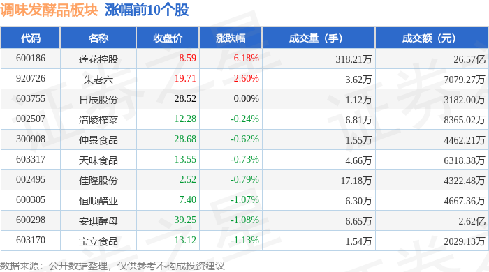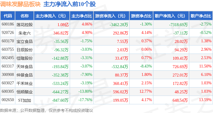 从资金流向上来看,当日调味发酵品板块主力资金净流出6412.9万元,游资资金净流出9156.34万元,散户资金净流入1.56亿元。调味发酵品板块个股资金流向见下表: