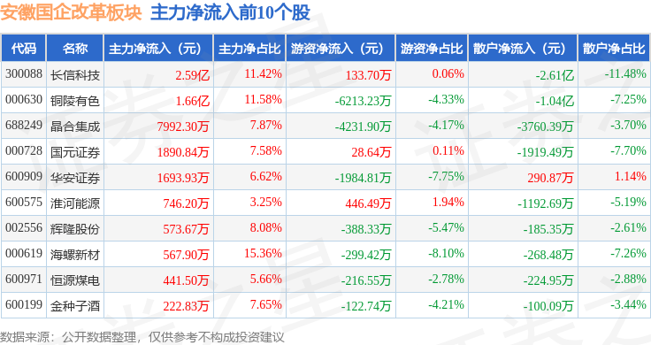 从资金流向上来看,当日安徽国企改革板块主力资金净流出2158.37万元,游资资金净流出2.29亿元,散户资金净流入2.5亿元。安徽国企改革板块个股资金流向见下表: