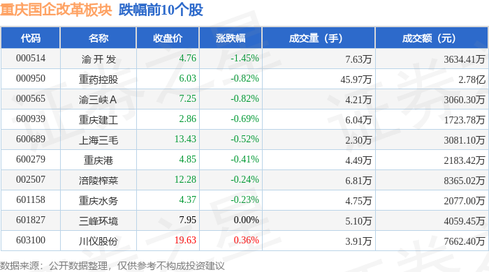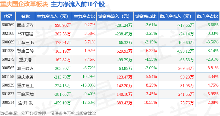 从资金流向上来看,当日重庆国企改革板块主力资金净流出3936.96万元,游资资金净流出277.44万元,散户资金净流入4214.4万元。重庆国企改革板块个股资金流向见下表: