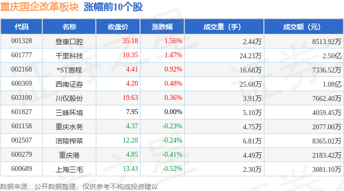 证券之星消息,4月22日重庆国企改革板块较上一交易日上涨0.37%,登康口腔领涨。当日上证指数报收于4106.26,上涨0.52%。深证成指报收于15177.29,上涨1.3%。重庆国企改革板块个股涨跌见下表:
