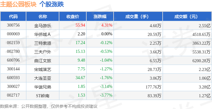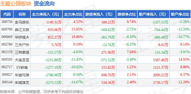 从资金流向上来看,当日主题公园板块主力资金净流出5770.67万元,游资资金净流入929.31万元,散户资金净流入4841.36万元。主题公园板块个股资金流向见下表: