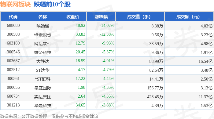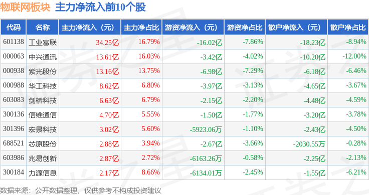 从资金流向上来看,当日物联网板块主力资金净流入91.98亿元,游资资金净流出39.98亿元,散户资金净流出52.0亿元。物联网板块个股资金流向见下表:
