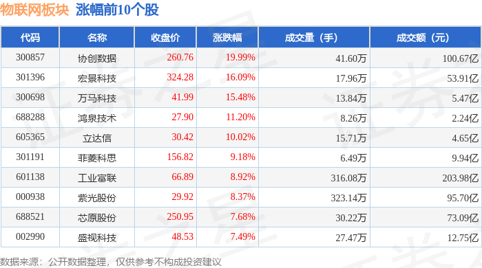 证券之星消息,4月22日物联网板块较上一交易日上涨2.78%,协创数据领涨。当日上证指数报收于4106.26,上涨0.52%。深证成指报收于15177.29,上涨1.3%。物联网板块个股涨跌见下表: