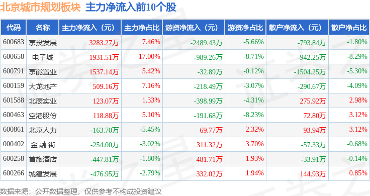 从资金流向上来看,当日北京城市规划板块主力资金净流出3.78亿元,游资资金净流入1.29亿元,散户资金净流入2.49亿元。北京城市规划板块个股资金流向见下表: