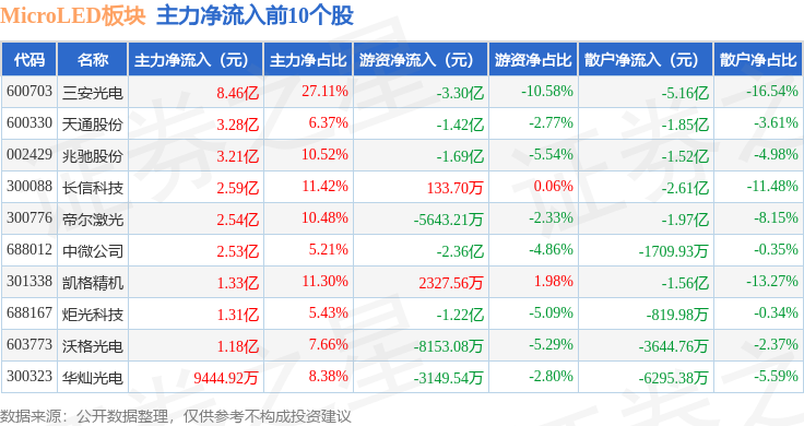 从资金流向上来看,当日MicroLED板块主力资金净流入27.8亿元,游资资金净流出15.77亿元,散户资金净流出12.03亿元。MicroLED板块个股资金流向见下表: