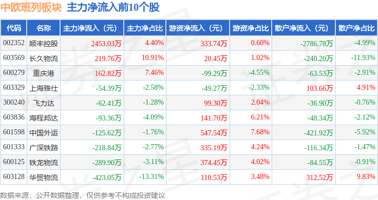 从资金流向上来看,当日中欧班列板块主力资金净流出6.94亿元,游资资金净流入3.45亿元,散户资金净流入3.49亿元。中欧班列板块个股资金流向见下表: