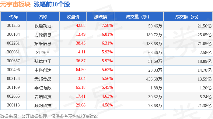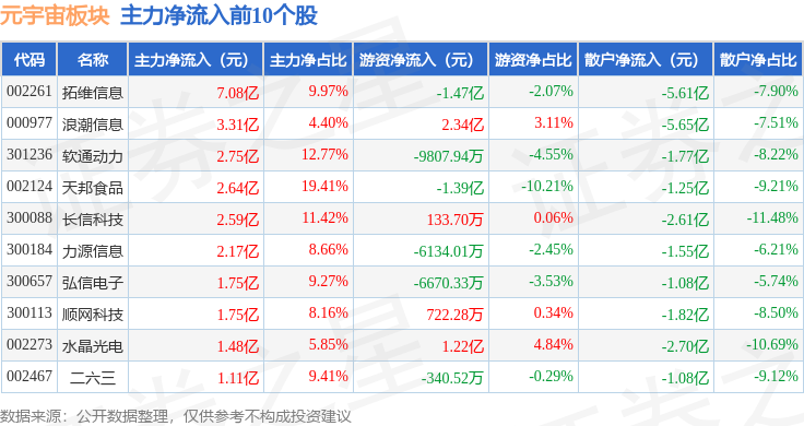 从资金流向上来看,当日元宇宙板块主力资金净流入7.48亿元,游资资金净流出2.61亿元,散户资金净流出4.87亿元。元宇宙板块个股资金流向见下表: