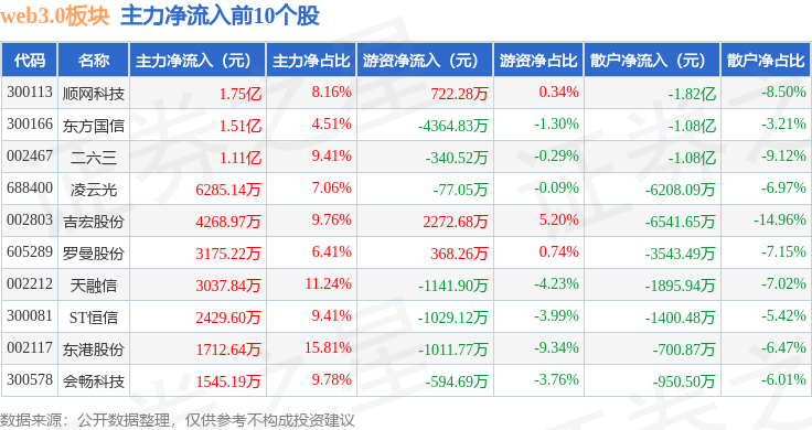 从资金流向上来看,当日web3.0板块主力资金净流入1.7亿元,游资资金净流出5618.2万元,散户资金净流出1.14亿元。web3.0板块个股资金流向见下表: