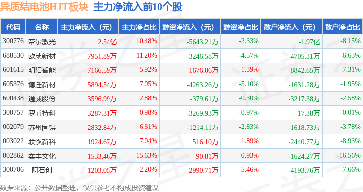 从资金流向上来看,当日异质结电池HJT板块主力资金净流出26.37亿元,游资资金净流入2.66亿元,散户资金净流入23.72亿元。异质结电池HJT板块个股资金流向见下表: