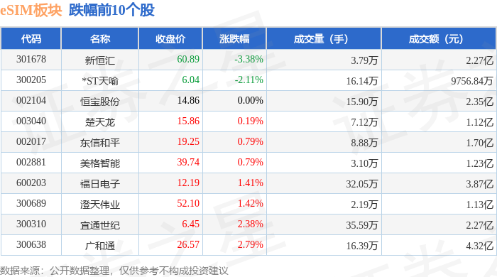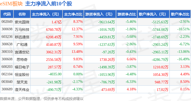 从资金流向上来看,当日eSIM板块主力资金净流入3.12亿元,游资资金净流出1.73亿元,散户资金净流出1.38亿元。eSIM板块个股资金流向见下表: