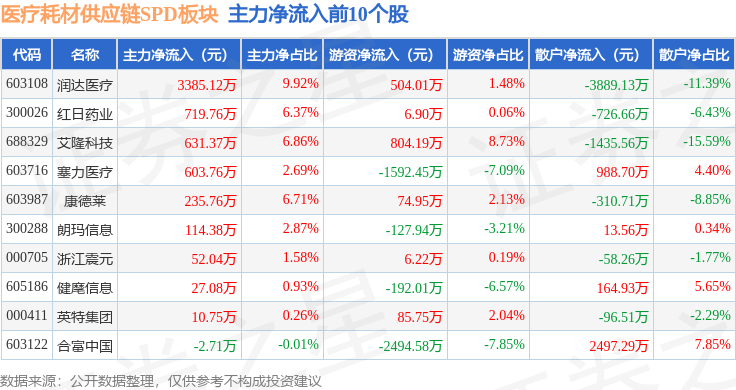 从资金流向上来看,当日医疗耗材供应链SPD板块主力资金净流出863.06万元,游资资金净流出1799.39万元,散户资金净流入2662.44万元。医疗耗材供应链SPD板块个股资金流向见下表: