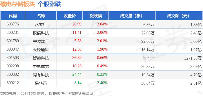 证券之星消息,4月22日磁电存储板块较上一交易日上涨0.87%,永安行领涨。当日上证指数报收于4106.26,上涨0.52%。深证成指报收于15177.29,上涨1.3%。磁电存储板块个股涨跌见下表: