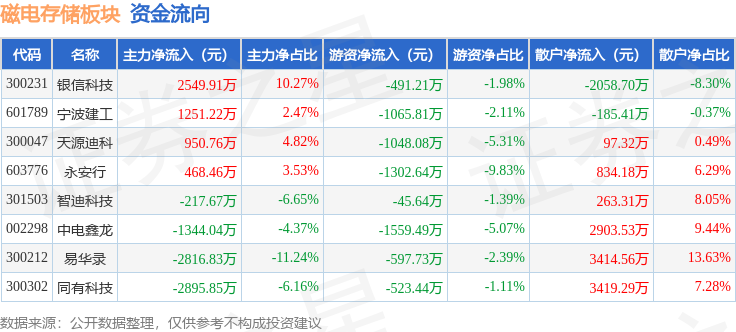 从资金流向上来看,当日磁电存储板块主力资金净流出2054.05万元,游资资金净流出6634.04万元,散户资金净流入8688.08万元。磁电存储板块个股资金流向见下表: