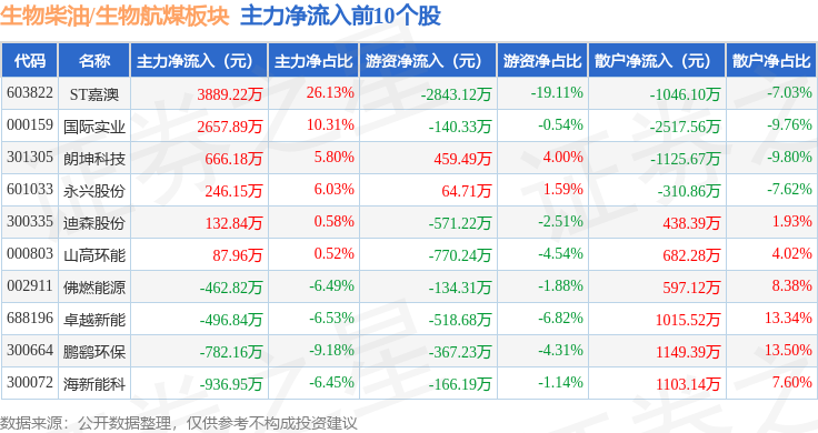 从资金流向上来看,当日生物柴油/生物航煤板块主力资金净流出2.18亿元,游资资金净流入1894.34万元,散户资金净流入1.99亿元。生物柴油/生物航煤板块个股资金流向见下表:
