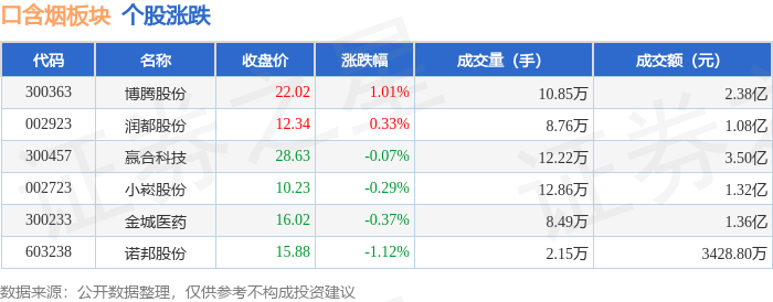 证券之星消息,4月22日口含烟板块较上一交易日上涨0.16%,博腾股份领涨。当日上证指数报收于4106.26,上涨0.52%。深证成指报收于15177.29,上涨1.3%。口含烟板块个股涨跌见下表:
