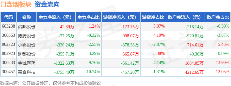 从资金流向上来看,当日口含烟板块主力资金净流出5804.92万元,游资资金净流入139.88万元,散户资金净流入5665.04万元。口含烟板块个股资金流向见下表: