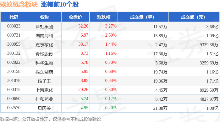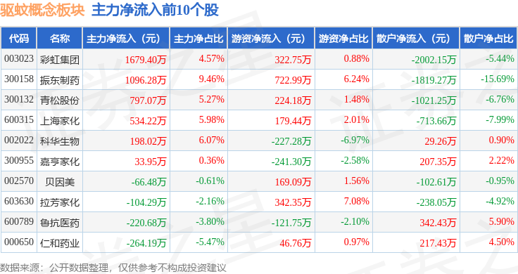 从资金流向上来看,当日驱蚊概念板块主力资金净流出5050.93万元,游资资金净流入3018.8万元,散户资金净流入2032.13万元。驱蚊概念板块个股资金流向见下表: