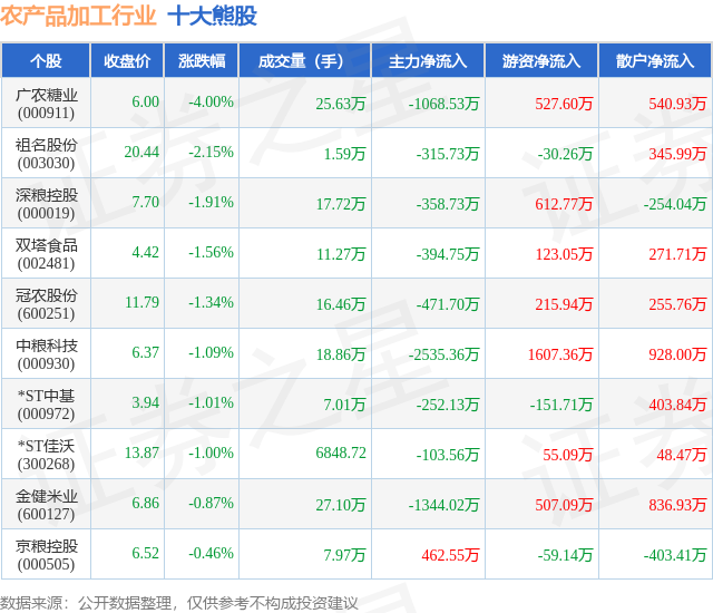 个股表现方面,农产品加工行业当日领跌股为广农糖业(000911),该股当日报收6.0,下跌4.0%,成交量25.63万,主力资金净流出1068.53万元。祖名股份(003030)以下跌2.15%紧随其后,该股当日成交量1.59万,主力资金净流出315.73万元。除此之外,深粮控股(000019)、双塔食品(002481)、冠农股份(600251)均进入当日熊股之列。具体个股列表见下表: