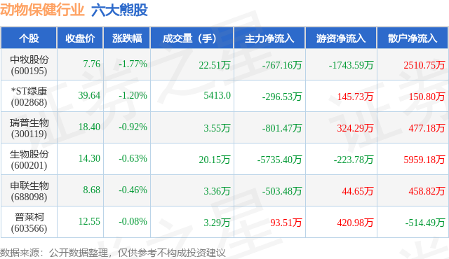 个股表现方面,动物保健行业当日领跌股为中牧股份(600195),该股当日报收7.76,下跌1.77%,成交量22.51万,主力资金净流出767.16万元。*ST绿康(002868)以下跌1.2%紧随其后,该股当日成交量5413.0,主力资金净流出296.53万元。除此之外,瑞普生物(300119)、生物股份(600201)、申联生物(688098)均进入当日熊股之列。具体个股列表见下表: