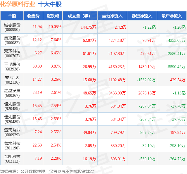 个股表现方面,化学原料行业当日领涨股为诚志股份(000990),该股当日报收11.94,上涨10.05%,成交量144.75万,主力资金净流入2.42亿元。奥克股份(300082)以上涨7.64%紧随其后,该股当日成交量62.07万,主力资金净流入4274.18万元。除此之外,双环科技(000707)、三孚股份(603938)、安 纳 达(002136)均进入当日牛股之列。具体个股列表见下表: