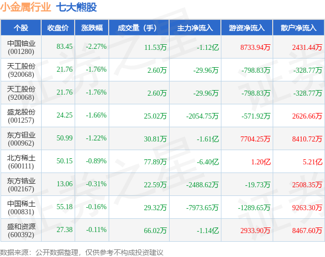 个股表现方面,小金属行业当日领跌股为中国铀业(001280),该股当日报收83.45,下跌2.27%,成交量11.53万,主力资金净流出1.12亿元。天工股份(920068)以下跌1.76%紧随其后,该股当日成交量2.6万,主力资金净流出29.96万元。除此之外,天工股份(920068)、盛龙股份(001257)、东方钽业(000962)均进入当日熊股之列。具体个股列表见下表: