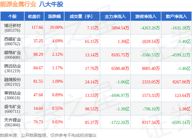 个股表现方面,能源金属行业当日领涨股为博迁新材(605376),该股当日报收117.66,上涨10.0%,成交量7.15万,主力资金净流入5894.54万元。西藏矿业(000762)以上涨4.69%紧随其后,该股当日成交量65.15万,主力资金净流入1.3亿元。除此之外,藏格矿业(000408)、腾远钴业(301219)、融捷股份(002192)均进入当日牛股之列。具体个股列表见下表: