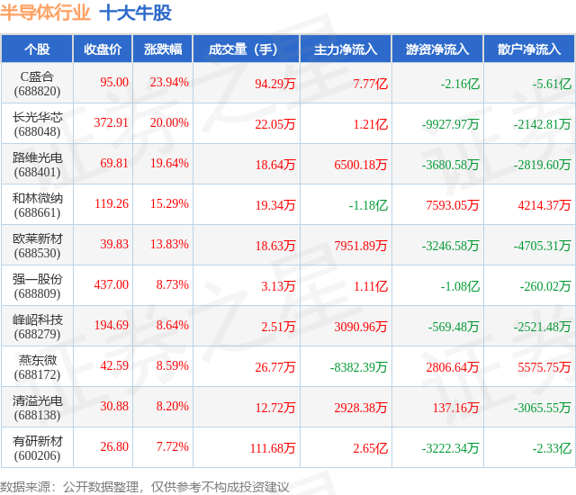 个股表现方面,半导体行业当日领涨股为C盛合(688820),该股当日报收95.0,上涨23.94%,成交量94.29万,主力资金净流入7.77亿元。长光华芯(688048)以上涨20.0%紧随其后,该股当日成交量22.05万,主力资金净流入1.21亿元。除此之外,路维光电(688401)、和林微纳(688661)、欧莱新材(688530)均进入当日牛股之列。具体个股列表见下表:
