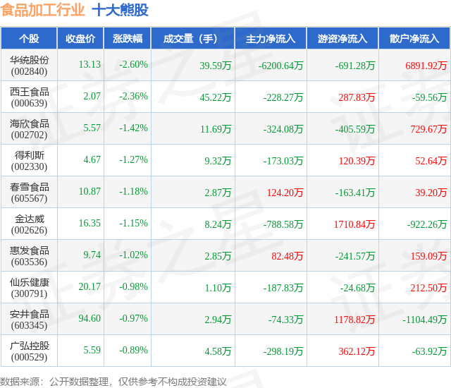 个股表现方面,食品加工行业当日领跌股为华统股份(002840),该股当日报收13.13,下跌2.6%,成交量39.59万,主力资金净流出6200.64万元。西王食品(000639)以下跌2.36%紧随其后,该股当日成交量45.22万,主力资金净流出228.27万元。除此之外,海欣食品(002702)、得利斯(002330)、春雪食品(605567)均进入当日熊股之列。具体个股列表见下表: