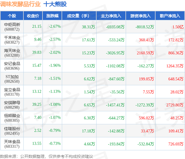 个股表现方面,调味发酵品行业当日领跌股为中炬高新(600872),该股当日报收21.15,下跌2.67%,成交量38.31万,主力资金净流出6935.08万元。千禾味业(603027)以下跌2.57%紧随其后,该股当日成交量17.61万,主力资金净流出533.24万元。除此之外,海天味业(603288)、安记食品(603696)、ST加加(002650)均进入当日熊股之列。具体个股列表见下表: