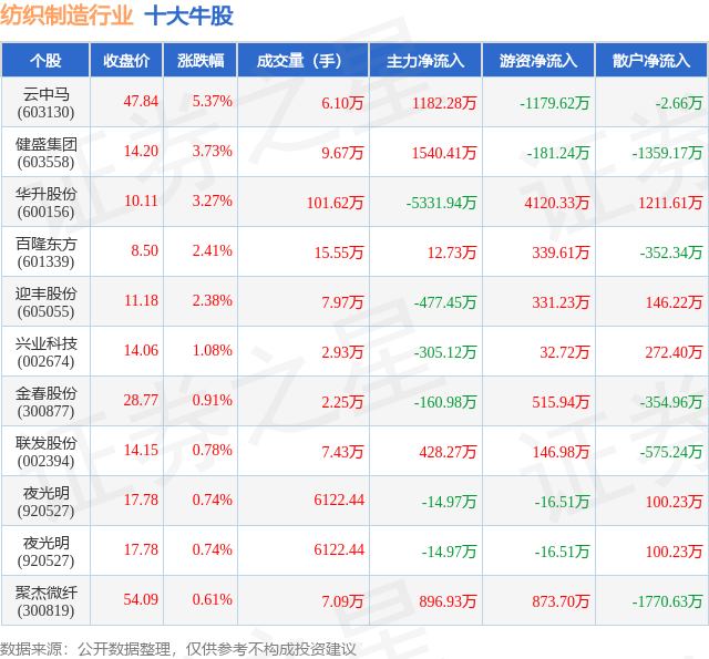 个股表现方面,纺织制造行业当日领涨股为云中马(603130),该股当日报收47.84,上涨5.37%,成交量6.1万,主力资金净流入1182.28万元。健盛集团(603558)以上涨3.73%紧随其后,该股当日成交量9.67万,主力资金净流入1540.41万元。除此之外,华升股份(600156)、百隆东方(601339)、迎丰股份(605055)均进入当日牛股之列。具体个股列表见下表: