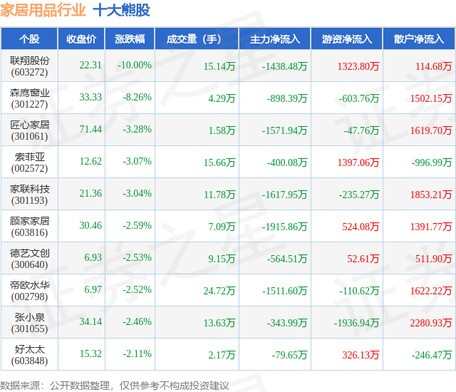 个股表现方面,家居用品行业当日领跌股为联翔股份(603272),该股当日报收22.31,下跌10.0%,成交量15.14万,主力资金净流出1438.48万元。森鹰窗业(301227)以下跌8.26%紧随其后,该股当日成交量4.29万,主力资金净流出898.39万元。除此之外,匠心家居(301061)、索菲亚(002572)、家联科技(301193)均进入当日熊股之列。具体个股列表见下表: