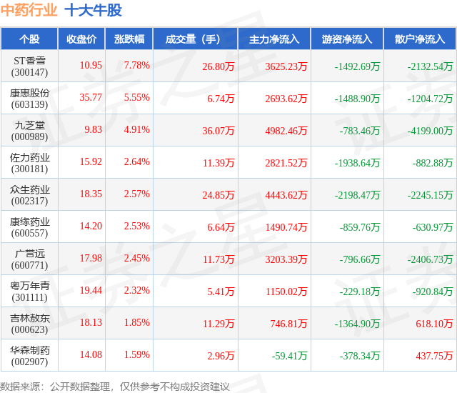 个股表现方面,中药行业当日领涨股为ST香雪(300147),该股当日报收10.95,上涨7.78%,成交量26.8万,主力资金净流入3625.23万元。康惠股份(603139)以上涨5.55%紧随其后,该股当日成交量6.74万,主力资金净流入2693.62万元。除此之外,九芝堂(000989)、佐力药业(300181)、众生药业(002317)均进入当日牛股之列。具体个股列表见下表: