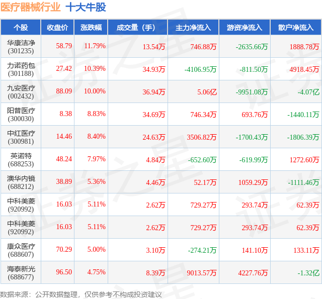 个股表现方面,医疗器械行业当日领涨股为华康洁净(301235),该股当日报收58.79,上涨11.79%,成交量13.54万,主力资金净流入746.88万元。力诺药包(301188)以上涨10.39%紧随其后,该股当日成交量34.93万,主力资金净流出4106.95万元。除此之外,九安医疗(002432)、阳普医疗(300030)、中红医疗(300981)均进入当日牛股之列。具体个股列表见下表: