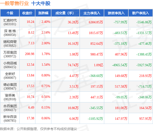 个股表现方面,一般零售行业当日领涨股为汇嘉时代(603101),该股当日报收10.24,上涨2.4%,成交量36.28万,主力资金净流入6304.85万元。深 赛 格(000058)以上涨2.14%紧随其后,该股当日成交量13.49万,主力资金净流入1815.07万元。除此之外,锦和商管(603682)、万辰集团(300972)、小商品城(600415)均进入当日牛股之列。具体个股列表见下表: