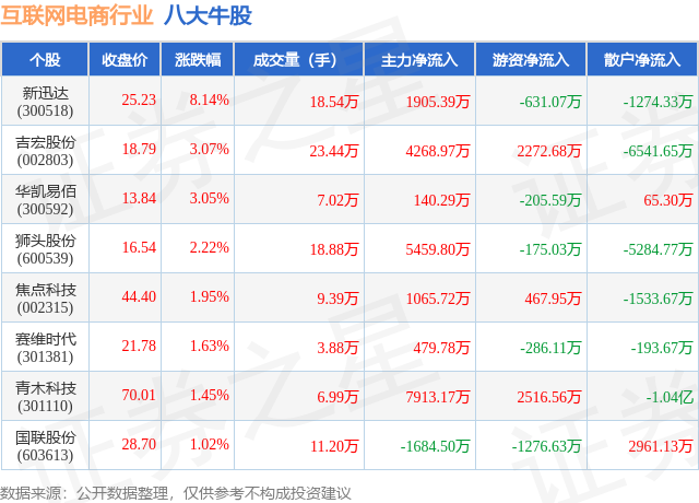 个股表现方面,互联网电商行业当日领涨股为新迅达(300518),该股当日报收25.23,上涨8.14%,成交量18.54万,主力资金净流入1905.39万元。吉宏股份(002803)以上涨3.07%紧随其后,该股当日成交量23.44万,主力资金净流入4268.97万元。除此之外,华凯易佰(300592)、狮头股份(600539)、焦点科技(002315)均进入当日牛股之列。具体个股列表见下表: