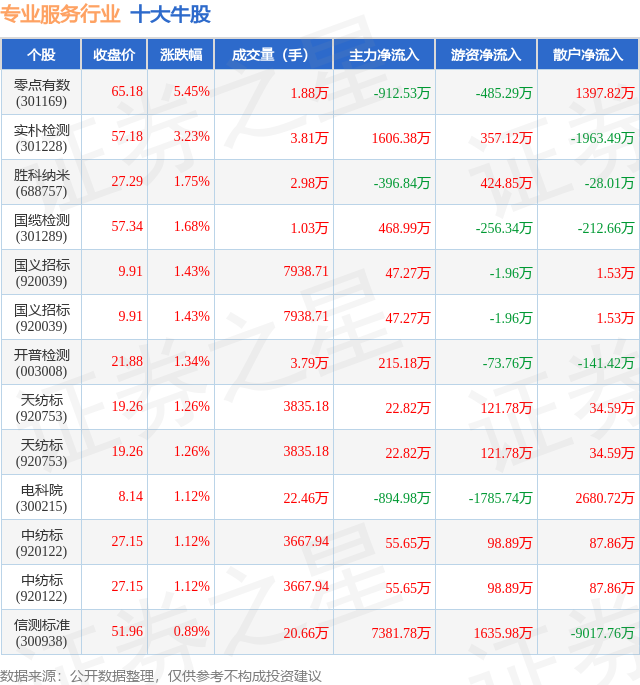 个股表现方面,专业服务行业当日领涨股为零点有数(301169),该股当日报收65.18,上涨5.45%,成交量1.88万,主力资金净流出912.53万元。实朴检测(301228)以上涨3.23%紧随其后,该股当日成交量3.81万,主力资金净流入1606.38万元。除此之外,胜科纳米(688757)、国缆检测(301289)、国义招标(920039)均进入当日牛股之列。具体个股列表见下表: